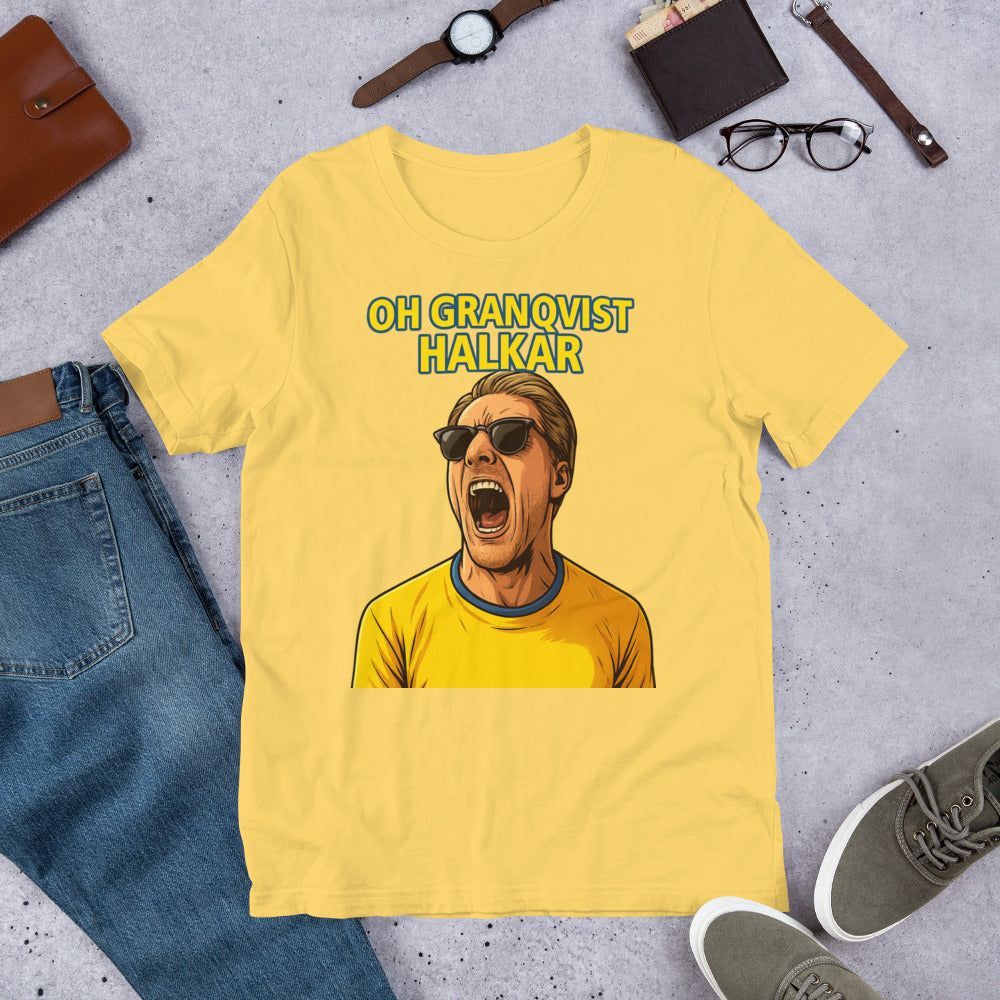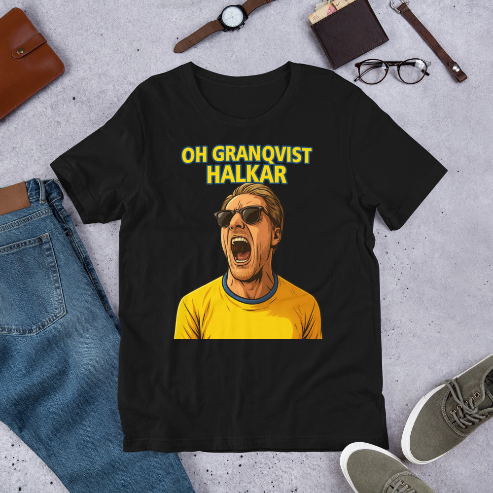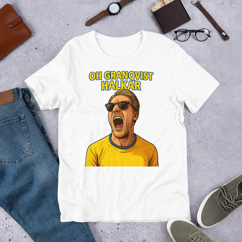 PRODUKTBESKRIVNING Budskapet på denna T-shirt är glasklart – ett ögonblick av ren, obeveklig svensk fotbollspassion. Motivet föreställer en svensk supporter som, direkt efter slutsignalen i den dramatiska matchen mot Italien, tappar det fullständigt när Granqvist halkar i slutsekunderna och det avgörande målet går in. Scenen bygger på den numera ikoniska och virala intervjun som svepte över hela landet – ett klipp som blivit ett kultfenomen bland svenska fotbollsfans. T-shirten fångar exakt den känslan: chocken, frustrationen och den råa, obearbetade reaktionen som så många kände just då. Det här är mer än ett plagg – det är ett stycke svensk fotbollshistoria. Perfekt för dig som vill bära dramatiken, humorn och minnet av ett av de mest omtalade ögonblicken på länge.