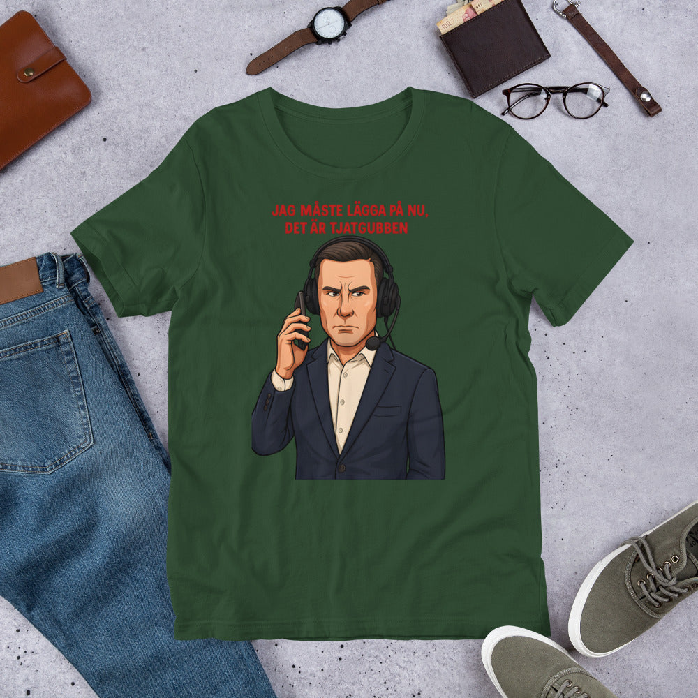 Den här T-shirten levererar ett budskap som är lika glasklart som det är roligt. Motivet bygger på det numera virala klippet där den före detta Frölunda-tränaren – mitt under en intervju – skämtsamt låtsas prata i telefon och ursäktar sig med orden att han måste lägga på eftersom ”tjatgubben” vill intervjua honom.