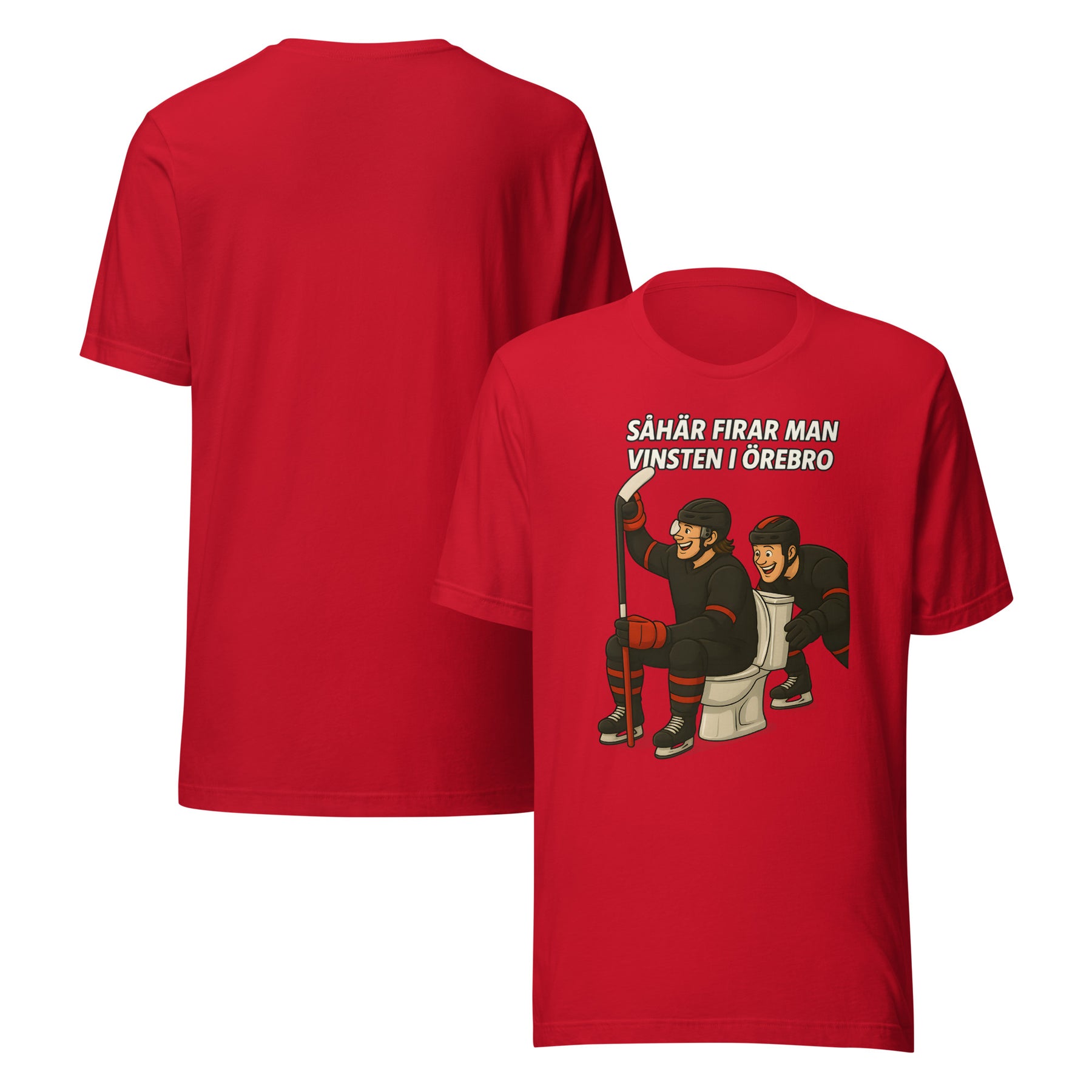 Den här T-shirten bär ett budskap som är lika glasklart som det är legendariskt. Motivet bygger på det oförglömliga ögonblicket då Örebro, efter en välförtjänt seger, valde att fira på sitt helt egna – och numera ikoniska – sätt. Mitt under firandet rullade spelarna nämligen ut på isen med en toalett som rekvisita, något som snabbt skapade hysteriska reaktioner både på läktaren och på nätet.