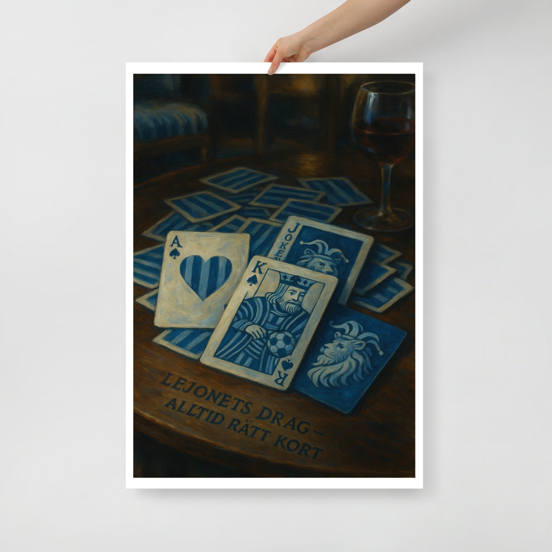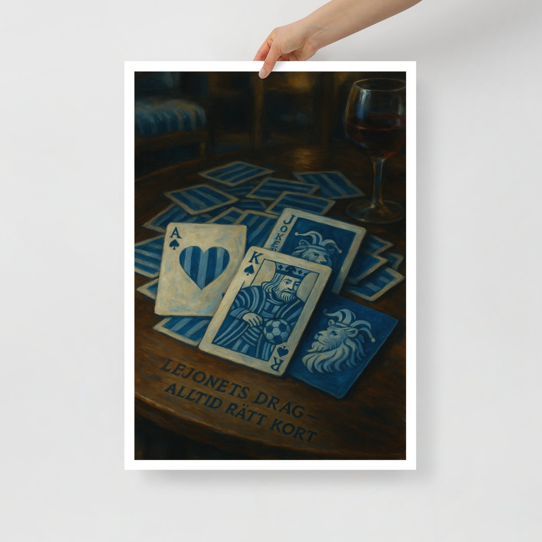 En exklusiv konstposter, tryckt på matt kvalitetspapper. Motivet visar ett elegant kortspel där hjärter ess, kung och joker ligger framme på bordet – alla prydda med lejonets stolta symbol. Vid sidan står ett glas vin, som förstärker känslan av stil, finess och självförtroende.