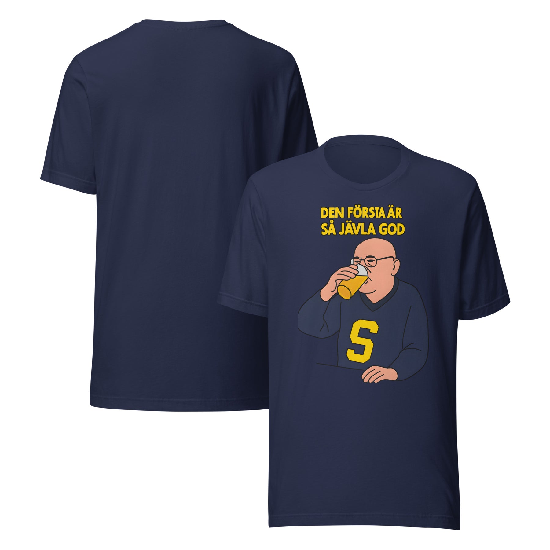 Den här T-shirten är ett måste för alla som älskar hockey, humor och klassiska supporterögonblick. Motivet är hämtat från en kultförklarad inspelning från 2015 där en Södertälje-supporter värmer upp inför ännu en intensiv match – självklart med en iskall öl i handen. Efter de första klunkarna levererar han det odödliga, numera legendariska citatet: “Den första är så jävla god.”